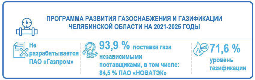 Уровень газификации Челябинской области по состоянию на 01 ноября 2022 года составляет 77,6% в общем, в городах и посёлках городского типа – 76,4%, в сельской местности – 48,7%. В столице области, городе Челябинске, процент газификации составляет 95,81%. Для сравнения, по всей Российской Федерации, по идентичным категориям проценты газификации составляют 71,4% в общем, 73,75% в городах и посёлках городского типа, 64,8% в сельской местности.